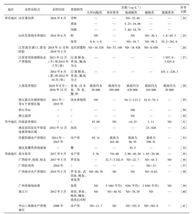 抗生素在国内不同水体中的含量分布具有较大的地域差异,且某些地区不同抗生素残留差异也较大。从地区上看,由于水产养殖在国内东部及东南部较发达,养殖水样采集地点多位于沿海省份。表2总结了各地水产养殖区水体中抗生素残留浓度情况。